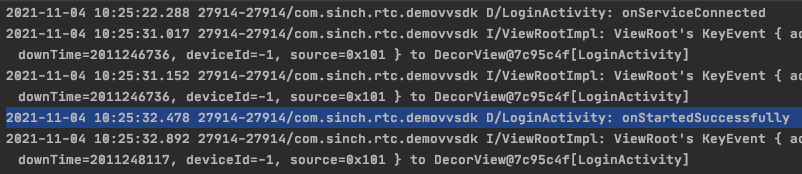 onServiceConnectedin BaseActivity callback assign provided binder to a local variable for later usage for communicating with the service and assignLoginActivityas a listener to get notifications about success or failure when starting Sinch client.BaseActivityprotected var sinchServiceInterface: SinchService.SinchServiceInterface? = null private set override fun onServiceConnected(componentName: ComponentName, iBinder: IBinder) { if (SinchService::class.java.name == componentName.className) { sinchServiceInterface = iBinder as SinchService.SinchServiceInterface onServiceConnected() } } protected open fun onServiceConnected() { // for subclasses }LoginActivityoverride fun onServiceConnected() { if (sinchServiceInterface?.isStarted == true) { openPlaceCallActivity() } else { sinchServiceInterface?.setStartListener(this) } } - Finally assign the login button a click listener that initiates and starts the Sinch client: